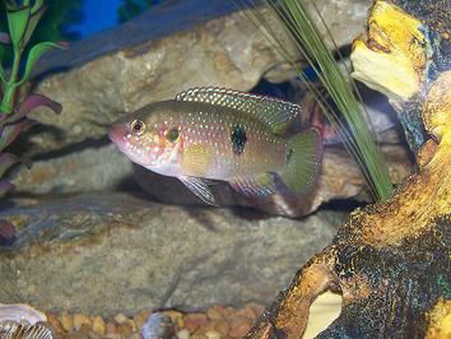 - 条纹珠宝鱼 (Hemichromis fasciatus) – 也被称为五点慈鲷,条纹珠宝鱼来自西非,在赞比西河上游、尼罗河流域和乍得湖都能找到。这种鱼长约25厘米,呈黄绿色,身体两侧有五个大型黑色斑块。这些鱼最适合成对饲养,应在至少55加仑的大水族箱中饲养。