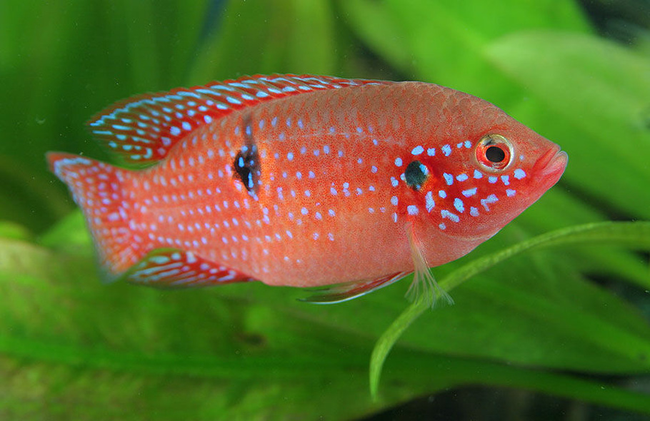 - 非洲珠宝鱼 (Hemichromis bimaculatus) – 这种珠宝慈鲷最长可达约15厘米,身体呈红色,带有蓝色斑点。这些鱼原产于西非,需要温暖的水温和略微酸性的pH值才能在家庭水族箱中茁壮成长。此外需要注意的是,这种鱼在繁殖期间可能会非常具有攻击性,因此可能不适合混养的慈鲷水族箱。