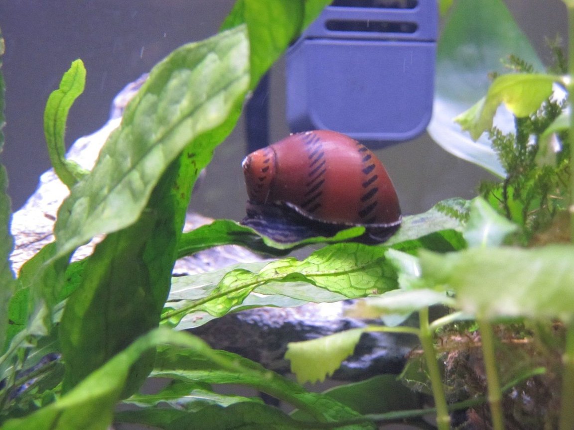 - 角宝螺属蜗牛(Neritina clithon corona)——这些宝螺属蜗牛的条纹非常厚,并且在壳的前部会长出角状的突起。