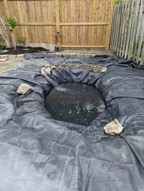 首先,通过移除任何尖锐的石头、树根或其他可能刺穿池塘衬垫的东西来准备池塘坑洞。同时,检查坑洞边缘周围是否有快速生长的木质植物,这些植物可能会在未来长出根系刺穿你的池塘衬垫。如果有这样的植物在坑洞周围,将其移除或重新安置。