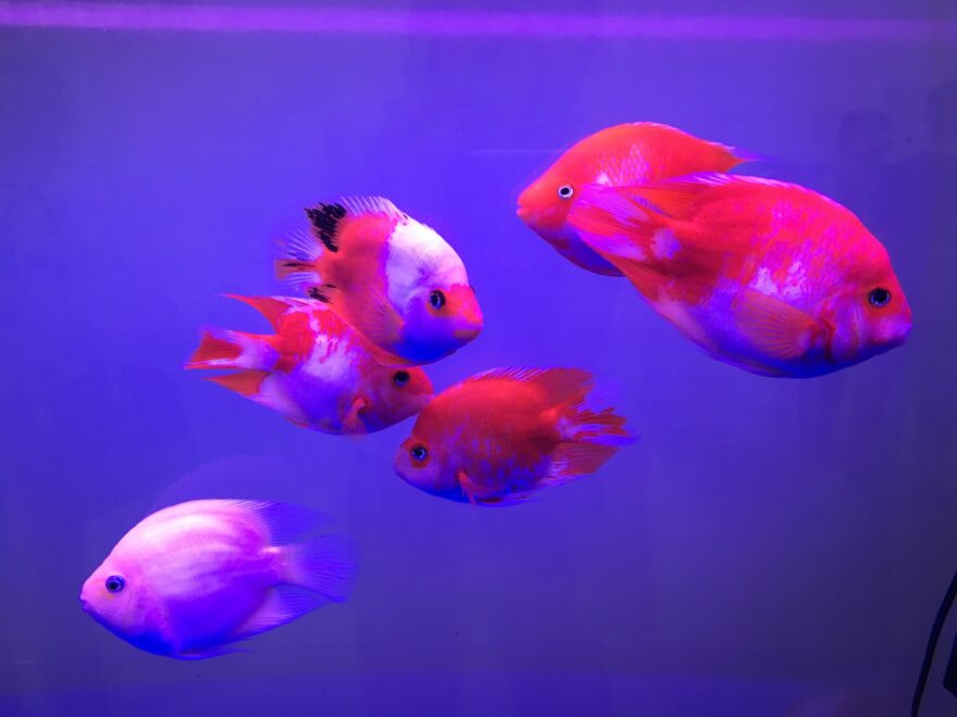 但是,如果你想要在大型社区水族箱或混合慈鲷水族箱中增加一块大的红色区域,并且不介意它们的背景,那么可以考虑饲养血鹦鹉慈鲷。