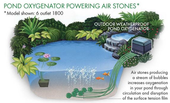 气泵是任何池塘的理想设备,因为它可以在氨或亚硝酸盐存在时帮助呼吸,当鱼生病时,使用药物时以及在炎热天气中都可以发挥作用。许多饲养锦鲤的池塘主人全年都会在他们的池塘中添加额外的气石,富含氧气的水也有助于需氧(氧气需求)有益滤菌细菌的生长。