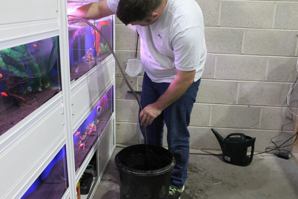 首先用藻刮清洁鱼缸。然后关闭过滤器和加热器,开始将水虹吸入地板上的桶中。你可能需要一些毛巾来擦拭任何滴漏和飞溅。最多可以取出鱼缸内25%的水,如果你有合适尺寸的石子真空管,也可以同时清理底砂。