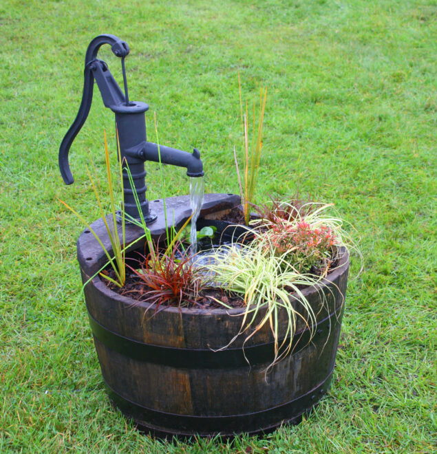 喷泉是自给自足的,这意味着从喷泉头、旧浇水壶、水墙、竹制喷泉或半桶水流出的水会落入下方的水盘中并被循环利用。因此,首先你需要一个可以容纳水的容器。这个容器可以是一个半桶威士忌酒桶、一个贝尔法斯特水槽、一个小池塘、一个大桶或一个专门设计的喷泉储水池。