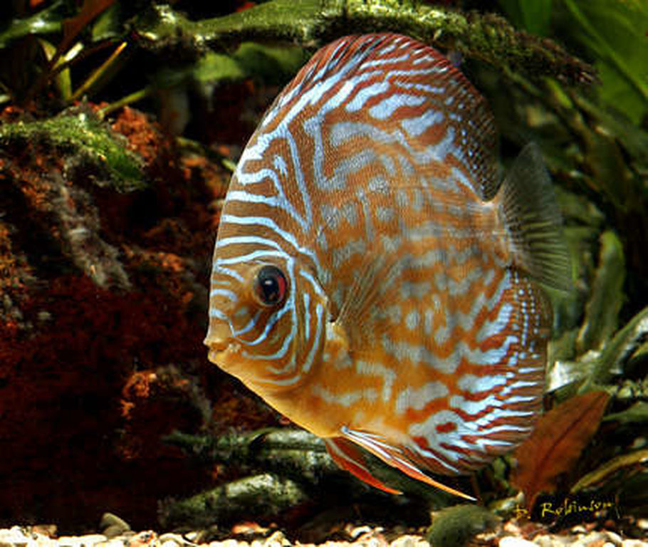 绿孔雀鱼 (Symphosodon aequifasciata aequifasciata)——这些孔雀鱼呈黄褐色,下半身有红色斑点,头部和上半身有蓝绿色标记。臀鳍和背鳍呈蓝绿色,带有红色标记。