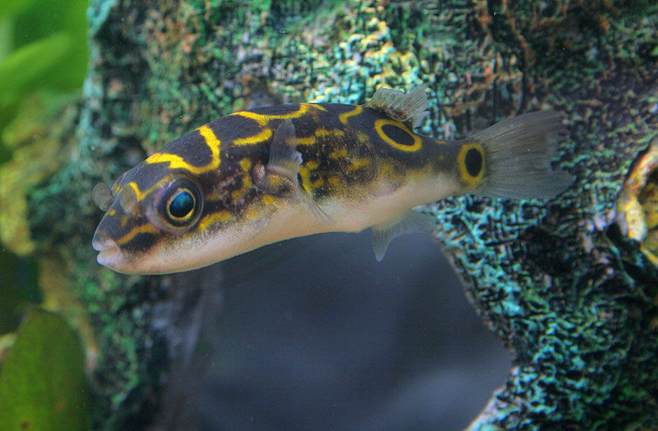 - 八字河豚(Tetraodon biocellatus) —— 这种中等大小的河豚鱼原产于亚洲,应该饲养在咸淡水环境中。八字河豚鱼最长可达3英寸,是一种非常具有攻击性的物种,特别是对同类。这种河豚鱼的颜色从深棕色到黑色不等,腹部为白色,并覆盖着黄色线条和/或斑点。最适合这种河豚鱼的水族箱是一个种植的咸淡水水族箱(假植物也可以),底部铺设沙子,并有足够的岩石结构提供藏身之处。