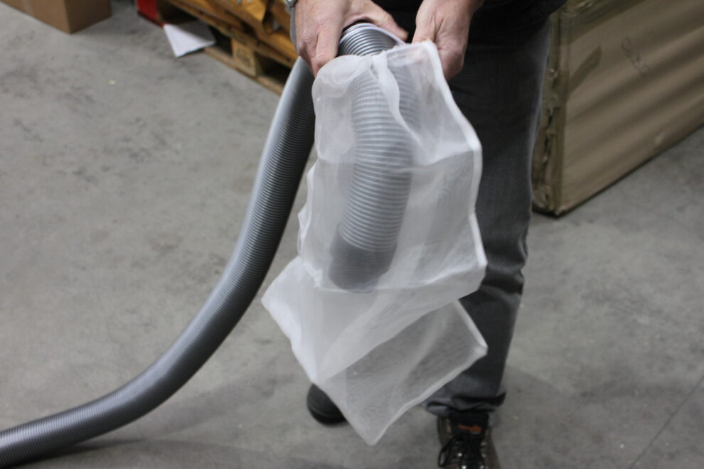 水显然通过一根管子吸入,进入池塘吸污机后,碎屑和废物会被过滤。下图是泥土收集袋,可以放在池塘上,使水通过,而废物留下。