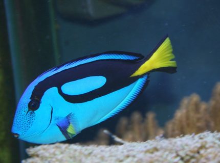 2. 蓝刺尾鱼(Paracanthurus hepatus)——最具辨识度的刺尾鱼种类之一,蓝刺尾鱼因其明亮的蓝色而得名。这些鱼的尾鳍呈黄色并带有黑色边缘,身体顶部从眼睛到尾巴有一条醒目的黑色标记。蓝刺尾鱼最长可达30厘米,是一种半好斗的鱼,护理起来中等难度。由于它们的体型和活动水平,蓝刺尾鱼需要至少180加仑容量的水族箱,并且不应与其他刺尾鱼混养。蓝刺尾鱼在礁岩缸中表现良好,可以吃藻类生长物,但你仍需每周几次用海洋藻类和海藻以及偶尔的肉类食品来补充其饮食。