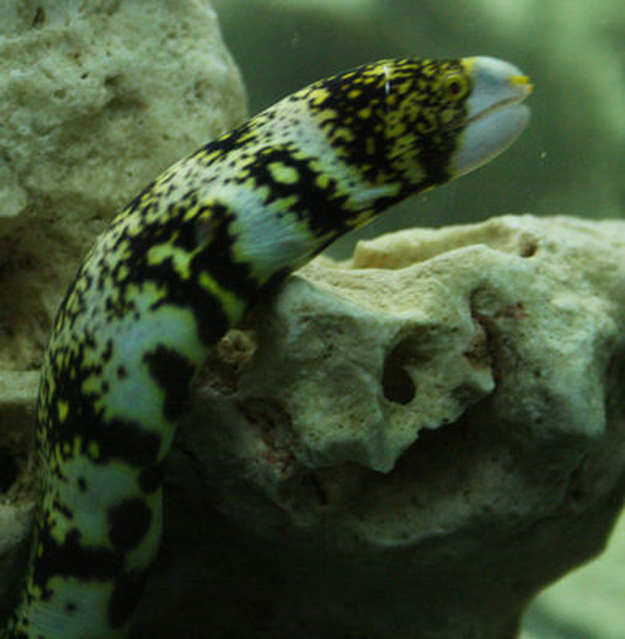 雪花海鳝 – 可能最容易饲养的海鳝种类是雪花海鳝。这种海鳝最大长度可达76厘米,可以在至少40加仑容量的水族箱中饲养。雪花海鳝主要以岸栖和岩石栖息的螃蟹为食,但也可能接受小鱼和螳螂虾。与其他许多海鳝相比,这种海鳝对其他水族箱居民构成的威胁较小,并且通常能很好地适应水族箱环境。不过请记住,大多数海鳝在食物在水中时都会变得更具攻击性。为了避免海鳝咬伤你或其他鱼,你应该使用喂食棒。